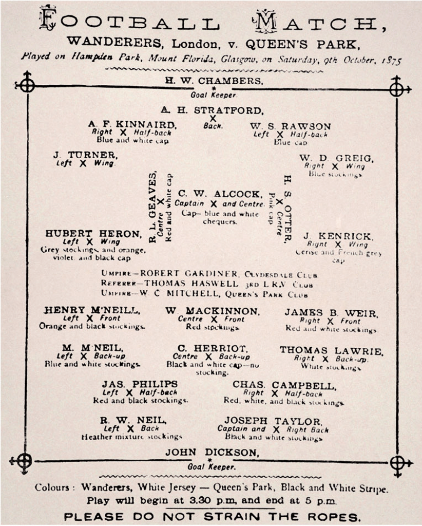 Numa altura em que ainda não havia manipulação e impressão de fotografias, o Queen's Park encontrou uma forma criativa de ajudar o público a identificar cada jogador. Como é possível ver na imagem, abaixo do nome e da posição de cada um dos atletas, está descrita... a cor das meias usadas. Porque sim, apesar de os onzes jogadores de cada lado utilizarem a mesma camisa e calção, as meias eram escolhidas individualmente por cada futebolista. E quando não havia meias, havia chapéu, de forma que mesmo o mais longínquo adepto – aquele que teve de subir à árvore – pudesse reconhecer o artista. Por exemplo, o extremo-esquerdo do Wanderers Hubert Heron apostava não só na sua velocidade, mas também num par de meias cinzentas, laranjas e violetas, com um chapéu preto.