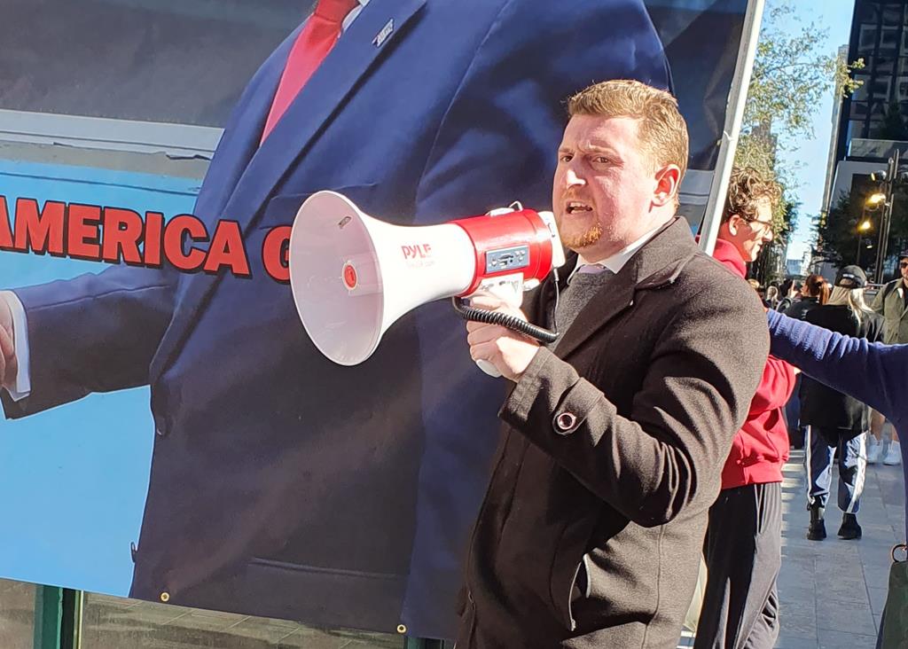 Quando Caleb projetava a voz em favor de Trump, eis que surge um homem, a solo, a desafiar o orador. Insulta-o e responde com palavras de ordem a cada slogan de Caleb, que se queixa de ser chamado de nazi por este homem que atravessou a fila de apoiantes de Trump com um boné encarnado de apoio a Kamala Harris e uma t-shirt que associa Trump aos nazis.
