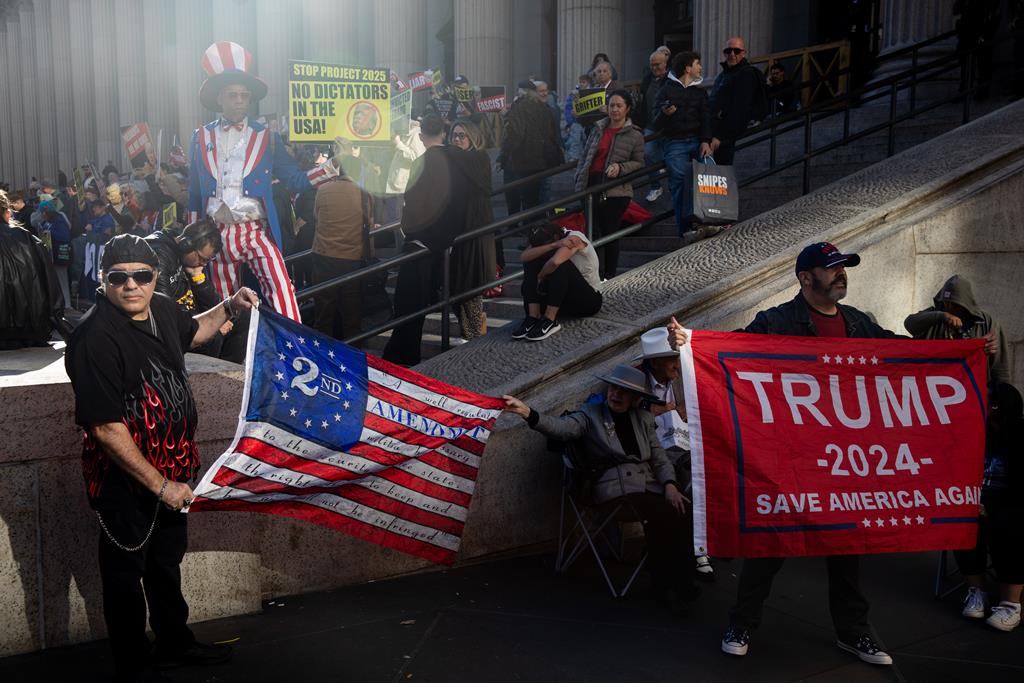 O campo anti-Trump foi colocado pela polícia no passeio contrário à fila de acesso ao Madison Square Garden, embora por vezes os apoiantes de ambas as partes levassem insultos e cartazes para a zona adversária. Foi assim que um homem de kippa judaica colorida e decorada com a cara de Trump fixou-se a poucos centímetros, quase nariz a nariz, dos que chamavam fascista ao homem que ia discursar na sala de espetáculos nova-iorquina.