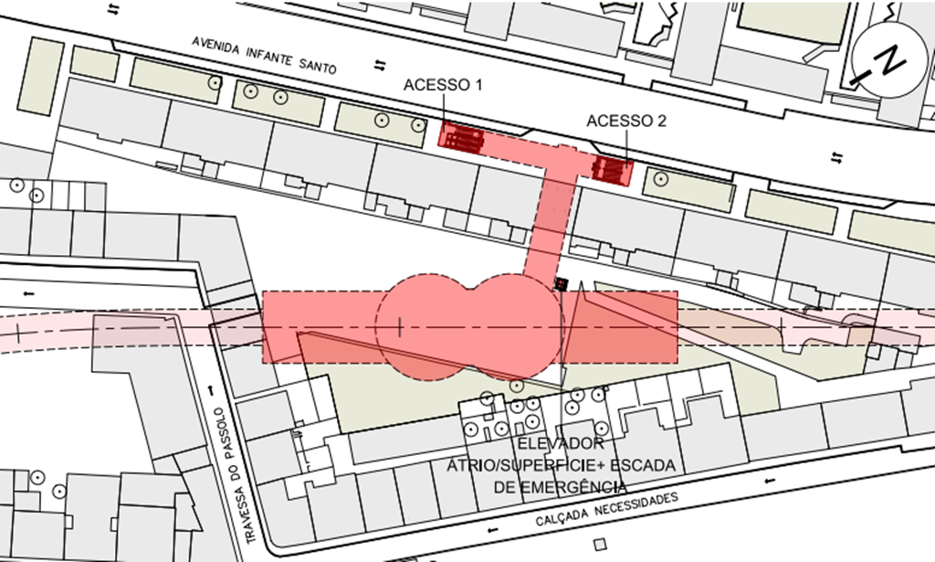 A estação de Infante Santo, localizada na freguesia da Lapa - entre a Avenida Infante Santo e a Calçada das Necessidades – vai ter três acessos: dois localizados na avenida, e um terceiro, com elevador, já no interior do quarteirão onde a estação vai ficar localizada. O parque de estacionamento por cima da estação vai ter lugar para 62 carros.
