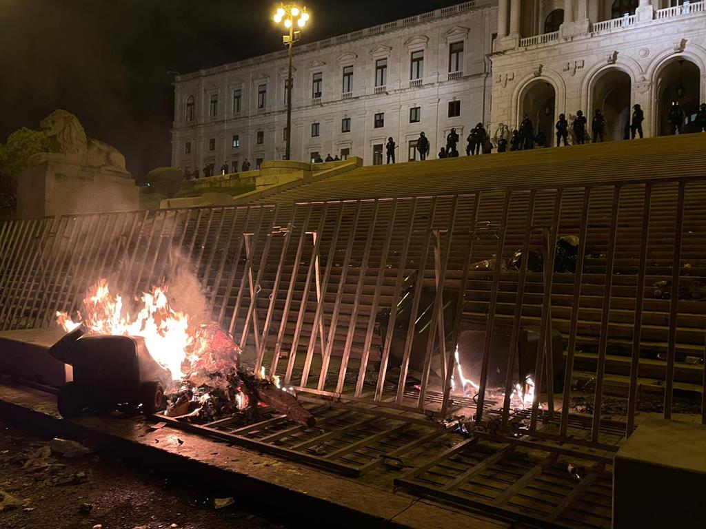 À frente do Parlamento, e já depois da saída do corpo de intervenção da PSP, restavam apenas vestígios do que ali se tinha passado: caixotes do lixo em cinzas e com pequenas chamas a serem apagadas por bombeiros, tinta na escadaria e no chão e um cartaz do PAN vandalizado, onde se lia “Prisão para quem rouba o povo. Pides morrem na rua”.