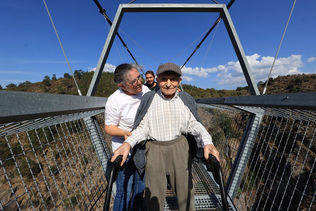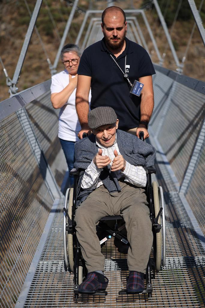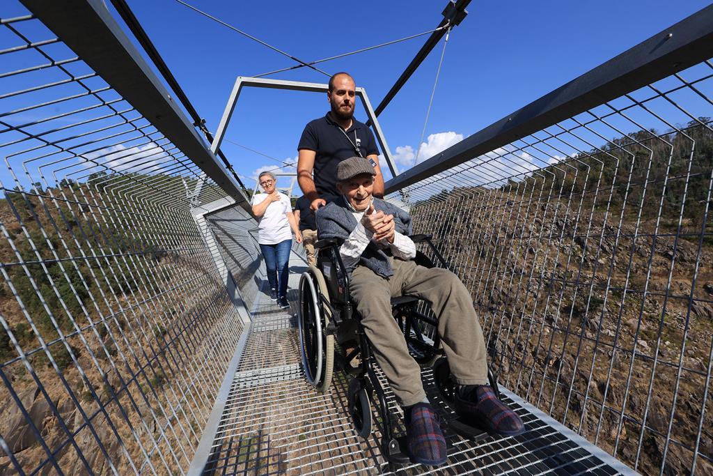 Manuel Gonçalves pensava que já não teria oportunidade de atravessar a ponte 516 Arouca, suspensa 175 metros acima do rio Paiva, mas concretizou o sonho aos 104 anos e nove meses de idade, em cadeira de rodas e andarilho.