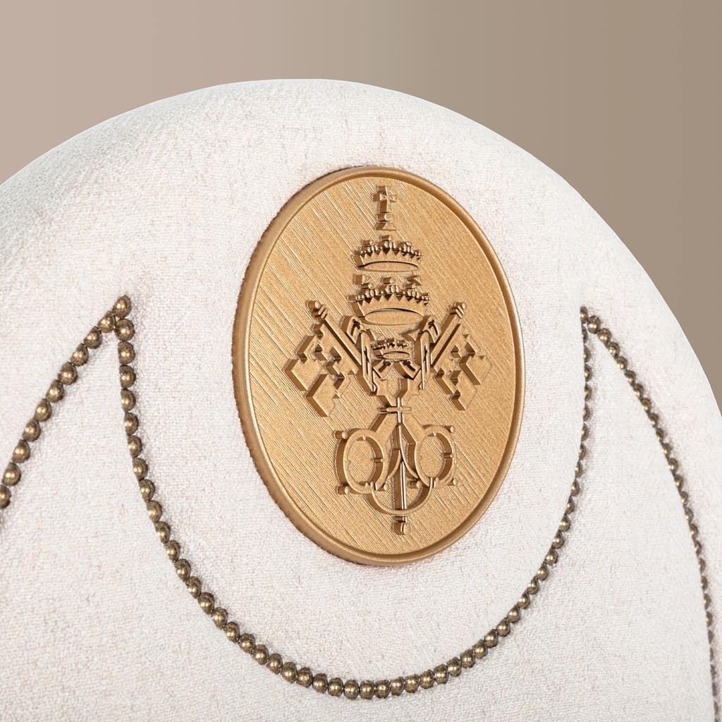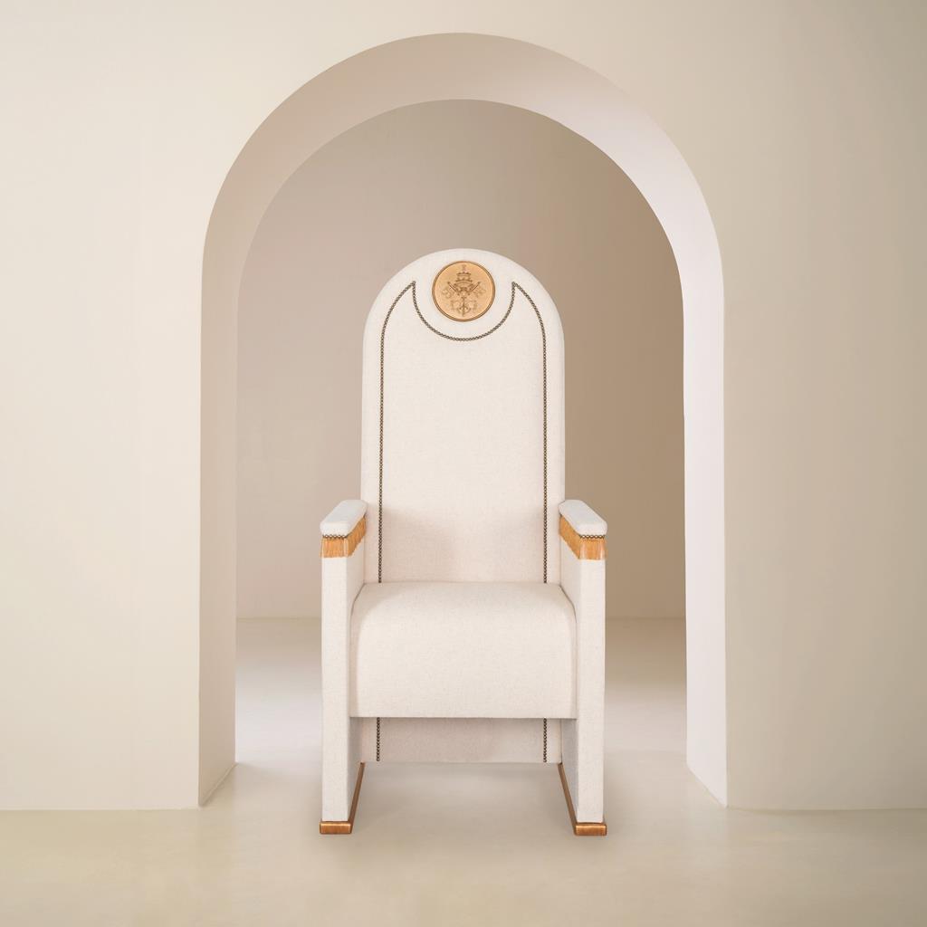 Para além da insígnia com o brasão do Vaticano, há tachas douradas em fileira a acompanhar os extremos da cadeira.